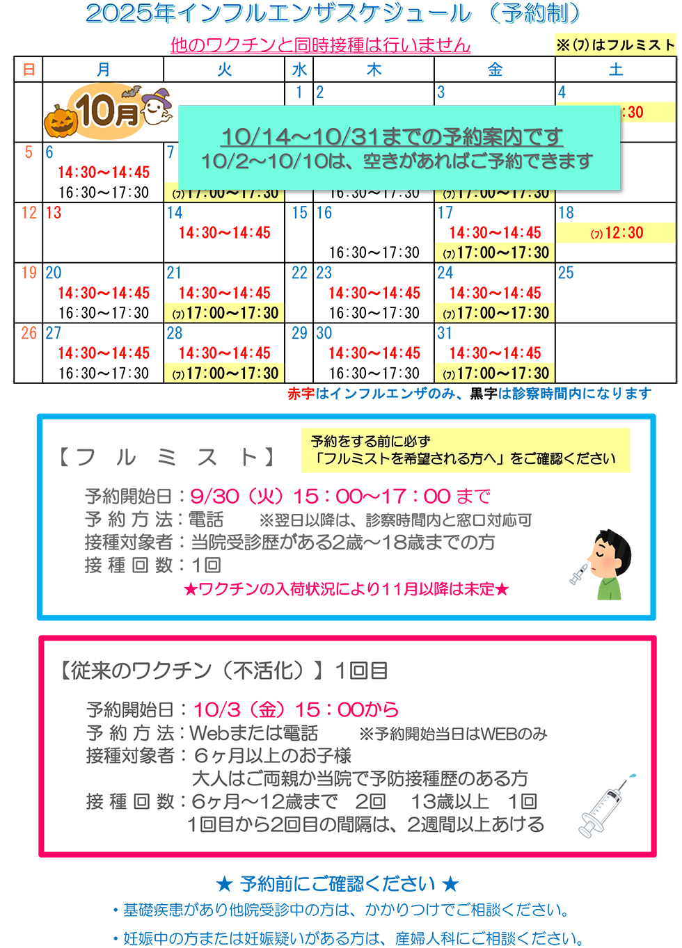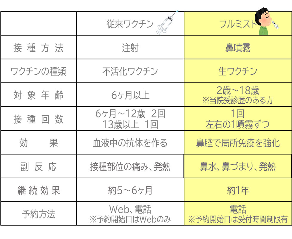 今年はワクチン点鼻タイプ「フルミスト」と従来の不活化ワクチンの2種類を行います。